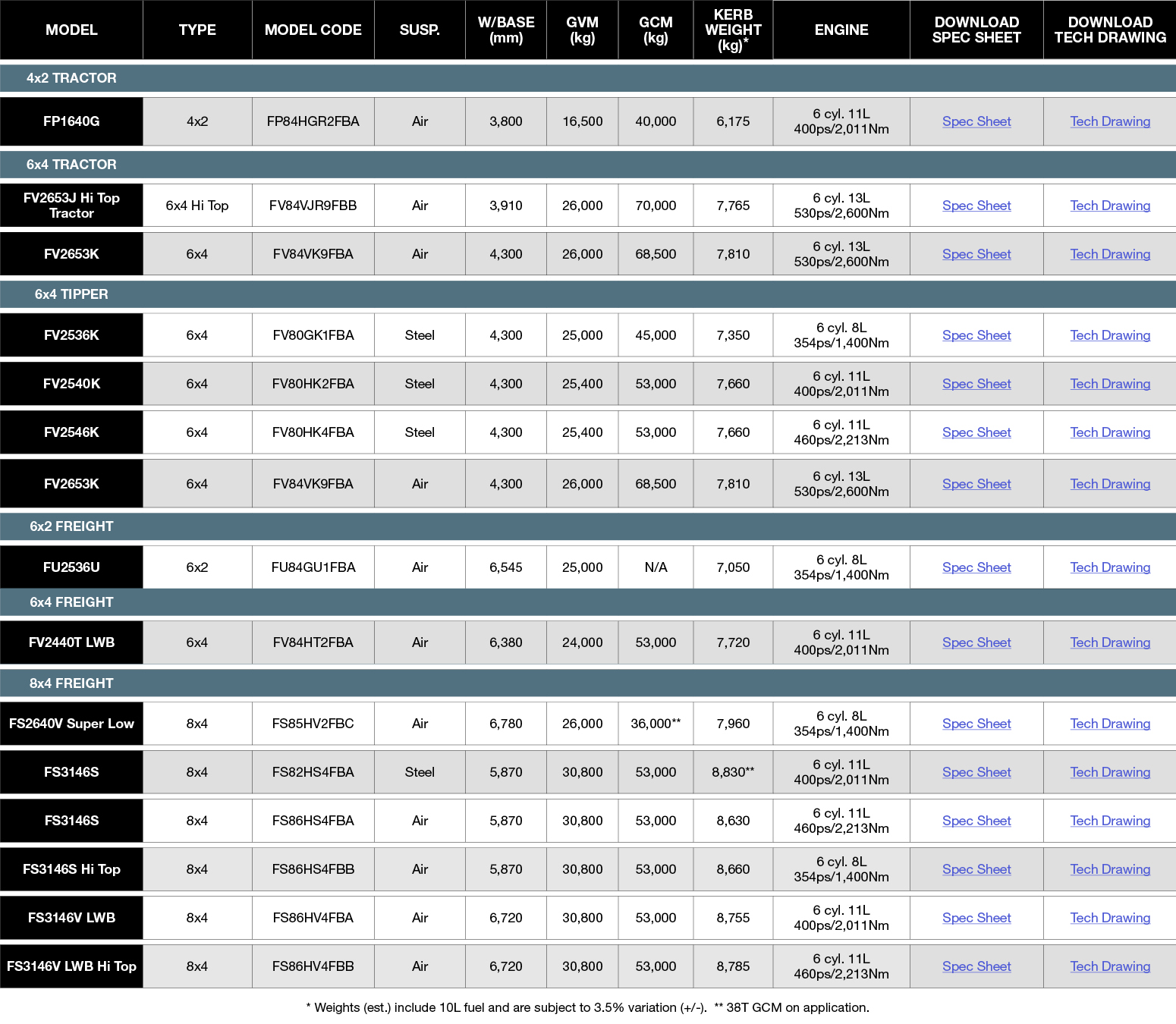 New models include the FV2653K 6x4 Tractor, targeted at linehaul operators, which offers up to a 1,000kg kerb weight advantage over direct competitors combined with a 70T GCM capability.